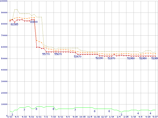 ※このグラフは過去のデータも税率5%相当に調整した税込み相当額のグラフです。 税率変更や、総額表示方式導入(2004年4月)の影響は除いています。 | | | ●凡例 | 最安値 (点線部は販売店未確認 または未調査) | 平均値 | 最高値 | ショップ数 |