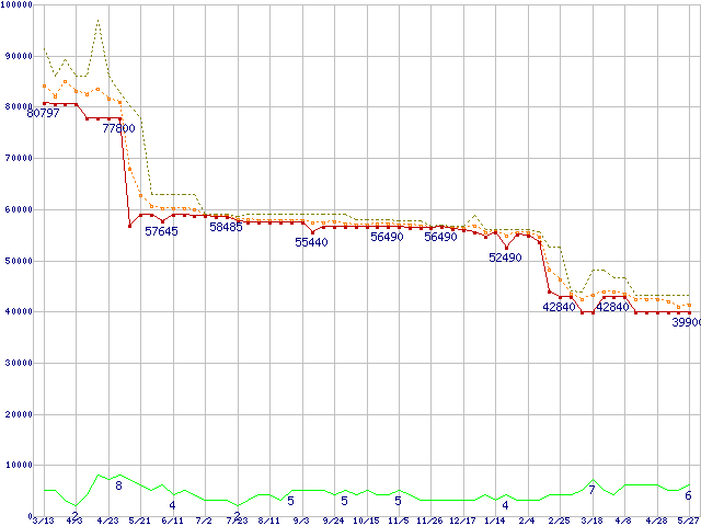 ※このグラフは過去のデータも税率5%相当に調整した税込み相当額のグラフです。 税率変更や、総額表示方式導入(2004年4月)の影響は除いています。 | | | ●凡例 | 最安値 (点線部は販売店未確認 または未調査) | 平均値 | 最高値 | ショップ数 |