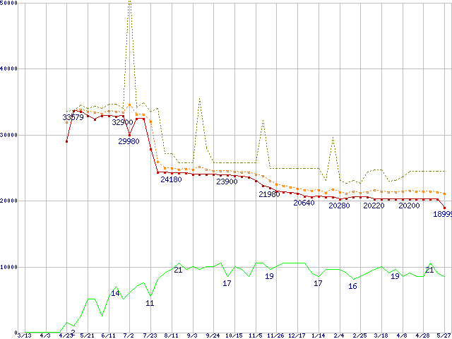 ※このグラフは過去のデータも税率5%相当に調整した税込み相当額のグラフです。 税率変更や、総額表示方式導入(2004年4月)の影響は除いています。 | | | ●凡例 | 最安値 (点線部は販売店未確認 または未調査) | 平均値 | 最高値 | ショップ数 |
