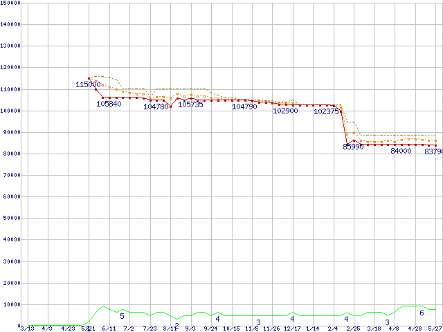 ※このグラフは過去のデータも税率5%相当に調整した税込み相当額のグラフです。 税率変更や、総額表示方式導入(2004年4月)の影響は除いています。 | | | ●凡例 | 最安値 (点線部は販売店未確認 または未調査) | 平均値 | 最高値 | ショップ数 |