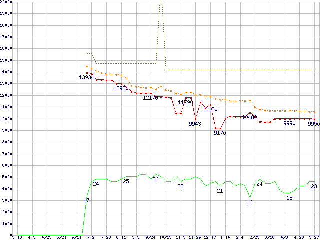 ※このグラフは過去のデータも税率5%相当に調整した税込み相当額のグラフです。 税率変更や、総額表示方式導入(2004年4月)の影響は除いています。 | | | ●凡例 | 最安値 (点線部は販売店未確認 または未調査) | 平均値 | 最高値 | ショップ数 |