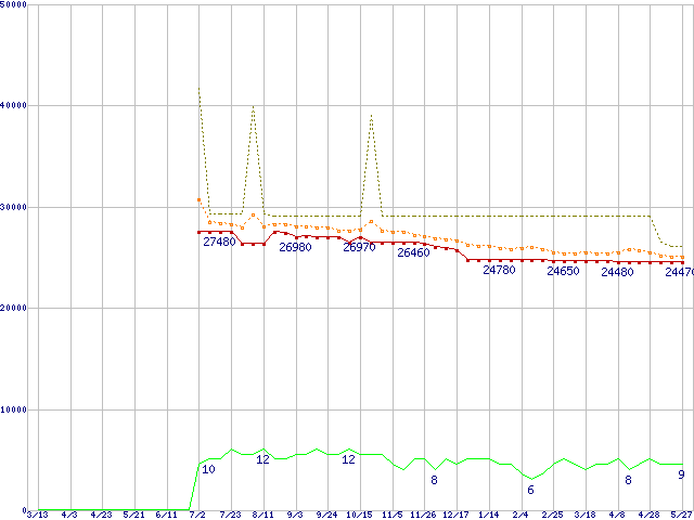 ※このグラフは過去のデータも税率5%相当に調整した税込み相当額のグラフです。 税率変更や、総額表示方式導入(2004年4月)の影響は除いています。 | | | ●凡例 | 最安値 (点線部は販売店未確認 または未調査) | 平均値 | 最高値 | ショップ数 |