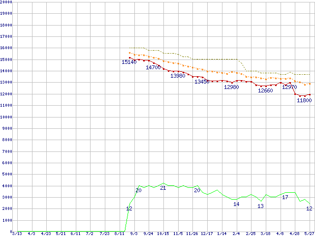 | Sempron 3100+(1.8GHz,L2 256KB,Socket 754) リテールパッケージの価格推移 | | | (2004年3月13日~2005年5月27日) |