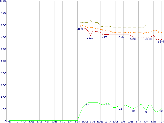 ※このグラフは過去のデータも税率5%相当に調整した税込み相当額のグラフです。 税率変更や、総額表示方式導入(2004年4月)の影響は除いています。 | | | ●凡例 | 最安値 (点線部は販売店未確認 または未調査) | 平均値 | 最高値 | ショップ数 |