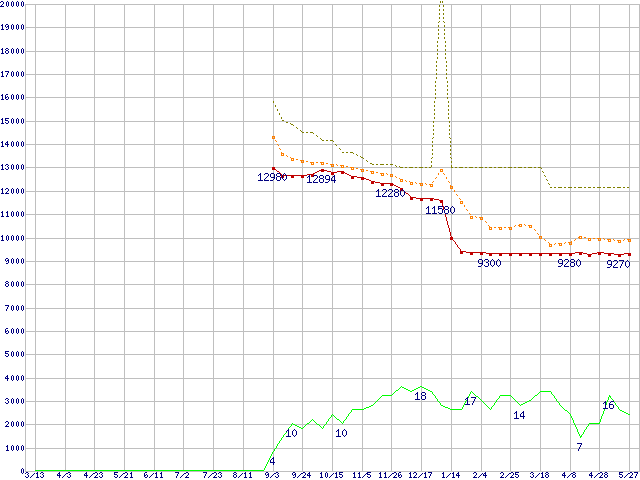 ※このグラフは過去のデータも税率5%相当に調整した税込み相当額のグラフです。 税率変更や、総額表示方式導入(2004年4月)の影響は除いています。 | | | ●凡例 | 最安値 (点線部は販売店未確認 または未調査) | 平均値 | 最高値 | ショップ数 |
