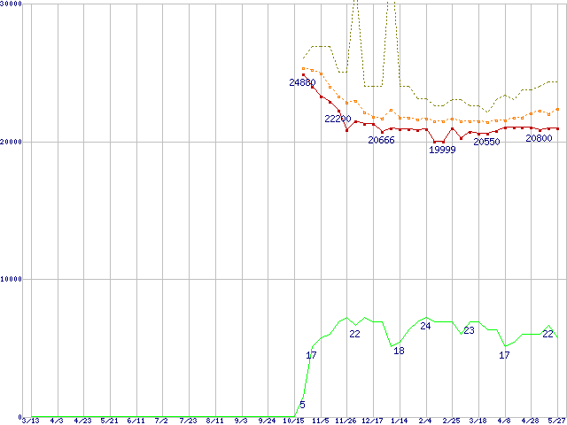 ※このグラフは過去のデータも税率5%相当に調整した税込み相当額のグラフです。 税率変更や、総額表示方式導入(2004年4月)の影響は除いています。 | | | ●凡例 | 最安値 (点線部は販売店未確認 または未調査) | 平均値 | 最高値 | ショップ数 |