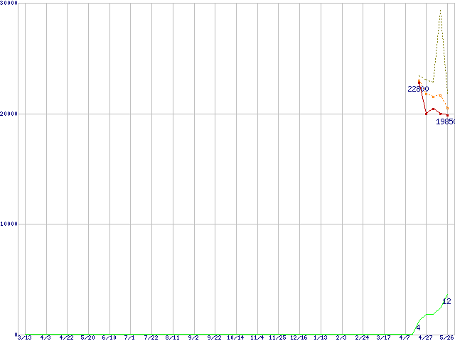 ※このグラフは過去のデータも税率5%相当に調整した税込み相当額のグラフです。 税率変更や、総額表示方式導入(2004年4月)の影響は除いています。 | | | ●凡例 | 最安値 (点線部は販売店未確認 または未調査) | 平均値 | 最高値 | ショップ数 |