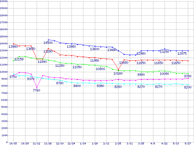 | LGA 775 (FC-LGA42,533MHz,L2 256KB,Prescott,NX bit対応)の最安値推移 | | | (2004年10月15日~2005年5月27日) |