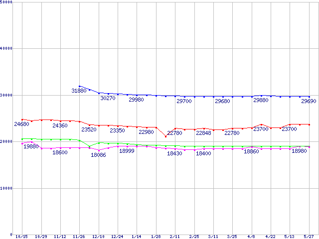 | Socket 478 (FC-PGA2,FSB 800MHz,L2 1MB,Hyper-Threading,Prescott)の最安値推移 | | | (2004年10月15日~2005年5月27日) |