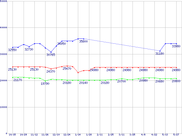 | Socket 478 (FC-PGA2,FSB 800MHz,L2 512KB,Hyper-Threading,Northwood)の最安値推移 | | | (2004年10月15日~2005年5月27日) |
