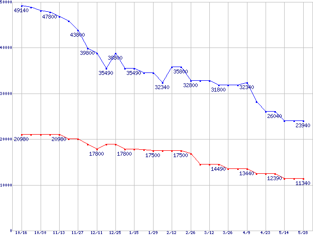 | PC2 3200(DDR2 400) DDR2 SDRAM DIMM ECC対応 Registeredタイプの最安値推移 | | | (2004年10月16日~2005年5月28日) |