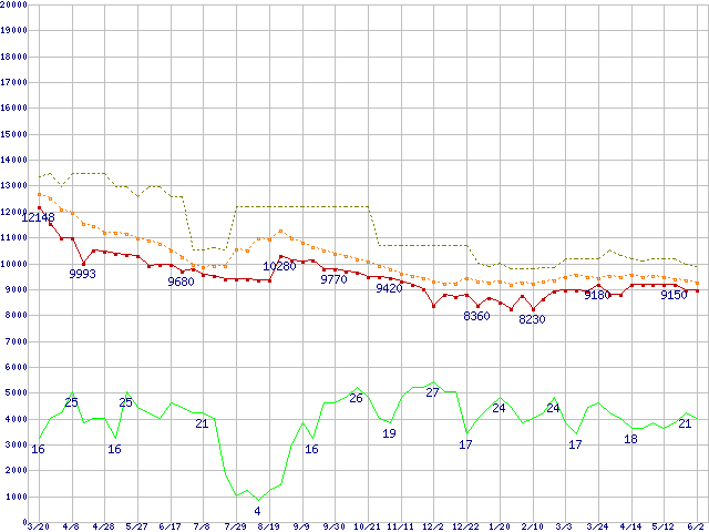 | Deskstar 7K250 HDS722516VLAT80 (160GB,8MB)の価格推移 | | | (2004年3月20日~2005年6月2日) |