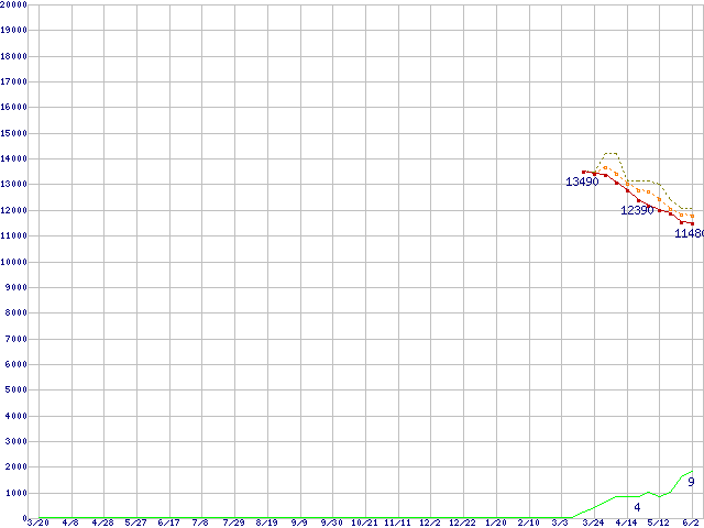 ※このグラフは過去のデータも税率5%相当に調整した税込み相当額のグラフです。 税率変更や、総額表示方式導入(2004年4月)の影響は除いています。 | | | ●凡例 | 最安値 (点線部は販売店未確認 または未調査) | 平均値 | 最高値 | ショップ数 |