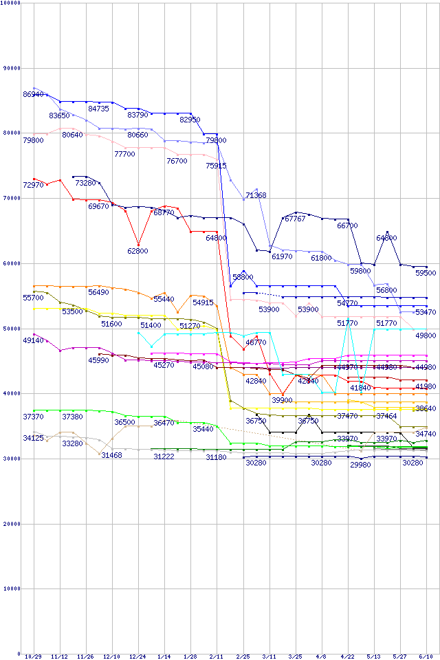 | CPU主要製品(最安値3万円~6万円未満)の最安値推移 | | | (2004年10月29日~2005年6月10日) |