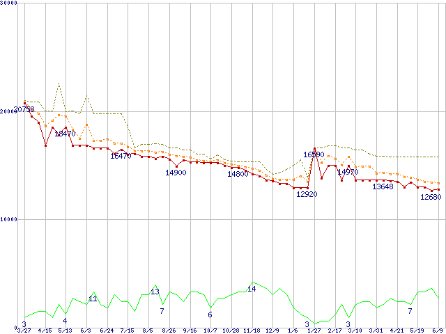 ※このグラフは過去のデータも税率5%相当に調整した税込み相当額のグラフです。 税率変更や、総額表示方式導入(2004年4月)の影響は除いています。 | | | ●凡例 | 最安値 (点線部は販売店未確認 または未調査) | 平均値 | 最高値 | ショップ数 |
