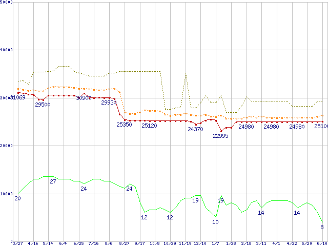 ※このグラフは過去のデータも税率5%相当に調整した税込み相当額のグラフです。 税率変更や、総額表示方式導入(2004年4月)の影響は除いています。 | | | ●凡例 | 最安値 (点線部は販売店未確認 または未調査) | 平均値 | 最高値 | ショップ数 |