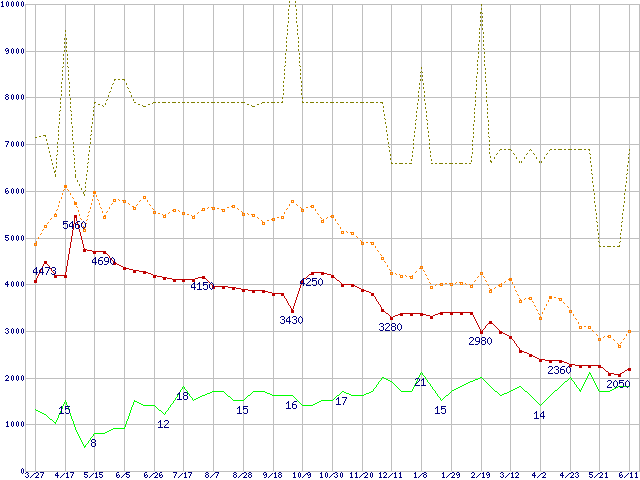 PC3200(DDR400) DDR SDRAM DIMMの最安値推移