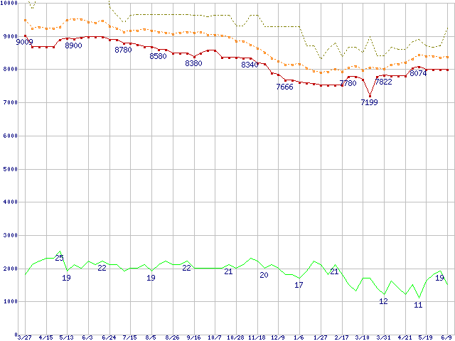 ※このグラフは過去のデータも税率5%相当に調整した税込み相当額のグラフです。 税率変更や、総額表示方式導入(2004年4月)の影響は除いています。 | | | ●凡例 | 最安値 (点線部は販売店未確認 または未調査) | 平均値 | 最高値 | ショップ数 |