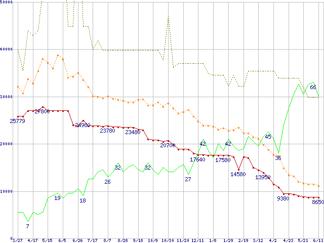 ※このグラフは過去のデータも税率5%相当に調整した税込み相当額のグラフです。 税率変更や、総額表示方式導入(2004年4月)の影響は除いています。 | | | ●凡例 | 最安値 (点線部は販売店未確認 または未調査) | 平均値 | 最高値 | ショップ数 |
