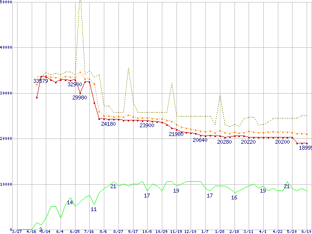 ※このグラフは過去のデータも税率5%相当に調整した税込み相当額のグラフです。 税率変更や、総額表示方式導入(2004年4月)の影響は除いています。 | | | ●凡例 | 最安値 (点線部は販売店未確認 または未調査) | 平均値 | 最高値 | ショップ数 |