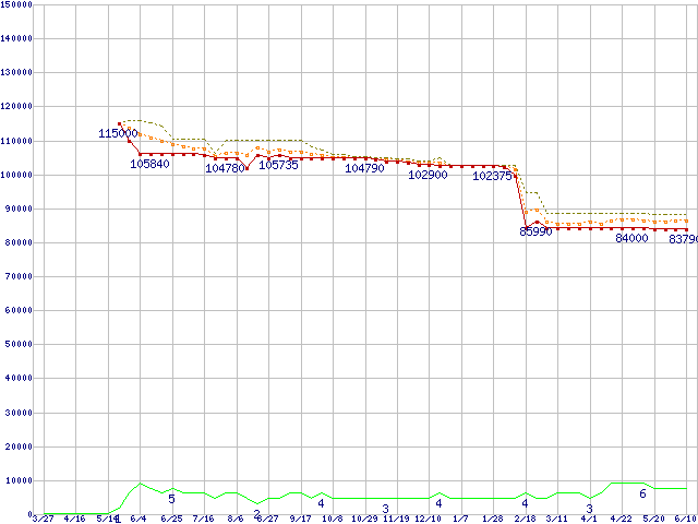 ※このグラフは過去のデータも税率5%相当に調整した税込み相当額のグラフです。 税率変更や、総額表示方式導入(2004年4月)の影響は除いています。 | | | ●凡例 | 最安値 (点線部は販売店未確認 または未調査) | 平均値 | 最高値 | ショップ数 |