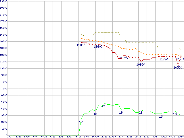 ※このグラフは過去のデータも税率5%相当に調整した税込み相当額のグラフです。 税率変更や、総額表示方式導入(2004年4月)の影響は除いています。 | | | ●凡例 | 最安値 (点線部は販売店未確認 または未調査) | 平均値 | 最高値 | ショップ数 |