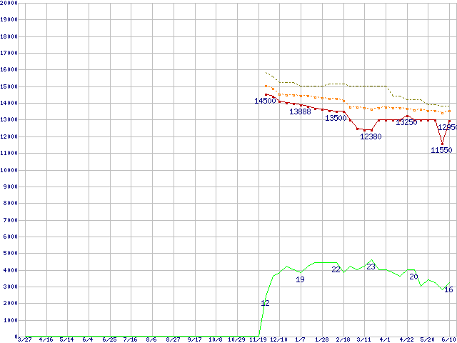 ※このグラフは過去のデータも税率5%相当に調整した税込み相当額のグラフです。 税率変更や、総額表示方式導入(2004年4月)の影響は除いています。 | | | ●凡例 | 最安値 (点線部は販売店未確認 または未調査) | 平均値 | 最高値 | ショップ数 |