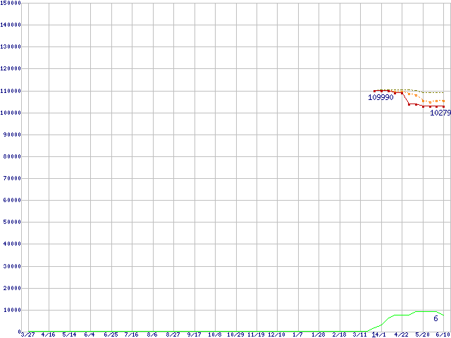 ※このグラフは過去のデータも税率5%相当に調整した税込み相当額のグラフです。 税率変更や、総額表示方式導入(2004年4月)の影響は除いています。 | | | ●凡例 | 最安値 (点線部は販売店未確認 または未調査) | 平均値 | 最高値 | ショップ数 |