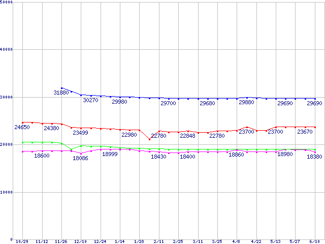 | Socket 478 (FC-PGA2,FSB 800MHz,L2 1MB,Hyper-Threading,Prescott)の最安値推移 | | | (2004年10月29日~2005年6月10日) |