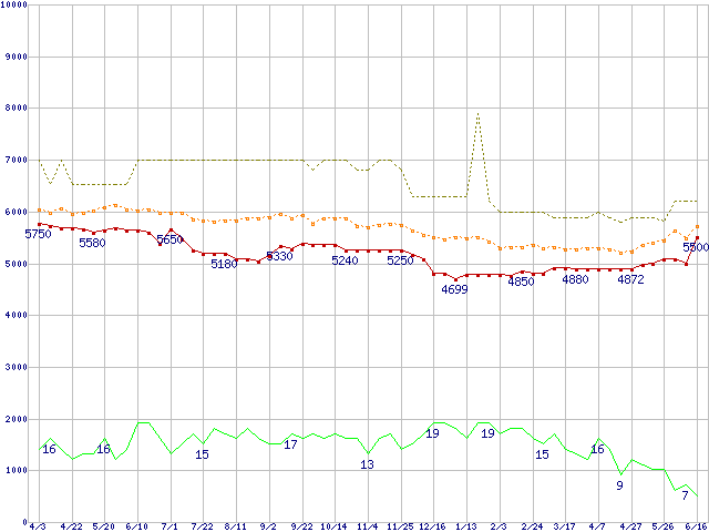 ※このグラフは過去のデータも税率5%相当に調整した税込み相当額のグラフです。 税率変更や、総額表示方式導入(2004年4月)の影響は除いています。 | | | ●凡例 | 最安値 (点線部は販売店未確認 または未調査) | 平均値 | 最高値 | ショップ数 |