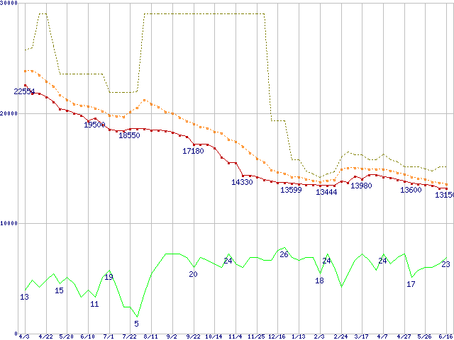 | Deskstar 7K250 HDS722525VLSA80 (250GB,8MB)の価格推移 | | | (2004年4月3日~2005年6月16日) |
