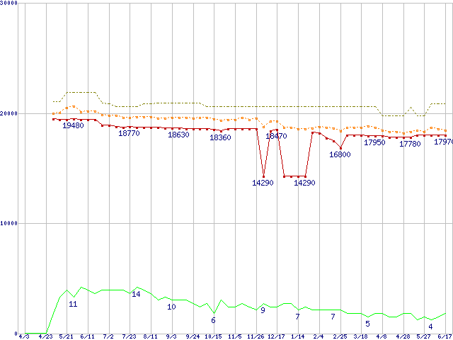 ※このグラフは過去のデータも税率5%相当に調整した税込み相当額のグラフです。 税率変更や、総額表示方式導入(2004年4月)の影響は除いています。 | | | ●凡例 | 最安値 (点線部は販売店未確認 または未調査) | 平均値 | 最高値 | ショップ数 |