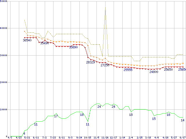 ※このグラフは過去のデータも税率5%相当に調整した税込み相当額のグラフです。 税率変更や、総額表示方式導入(2004年4月)の影響は除いています。 | | | ●凡例 | 最安値 (点線部は販売店未確認 または未調査) | 平均値 | 最高値 | ショップ数 |