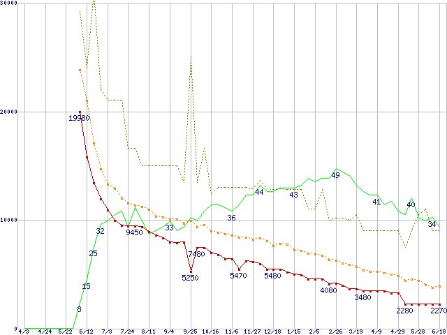 ※このグラフは過去のデータも税率5%相当に調整した税込み相当額のグラフです。 税率変更や、総額表示方式導入(2004年4月)の影響は除いています。 | | | ●凡例 | 最安値 (点線部は販売店未確認 または未調査) | 平均値 | 最高値 | ショップ数 |