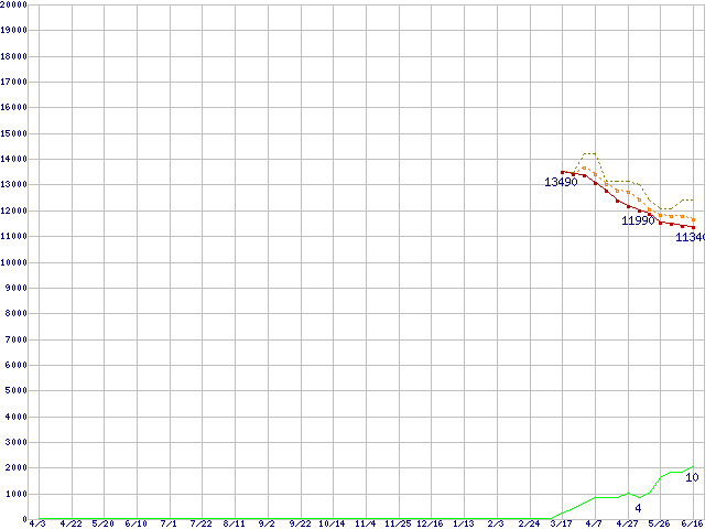 ※このグラフは過去のデータも税率5%相当に調整した税込み相当額のグラフです。 税率変更や、総額表示方式導入(2004年4月)の影響は除いています。 | | | ●凡例 | 最安値 (点線部は販売店未確認 または未調査) | 平均値 | 最高値 | ショップ数 |