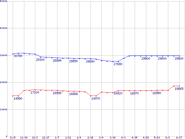| LGA 775 (FC-LGA4 ,FSB 800MHz,L2 1MB,Hyper-Threading,Prescott)の最安値推移 | | | (2004年11月5日~2005年6月17日) |