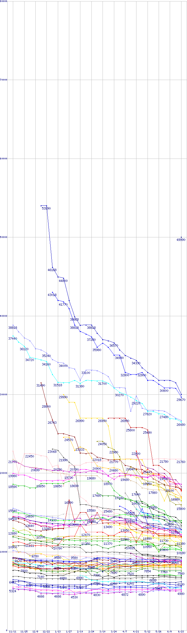 [前グラフ]:HDD主要製品(最安値2万円以上)の最安値推移