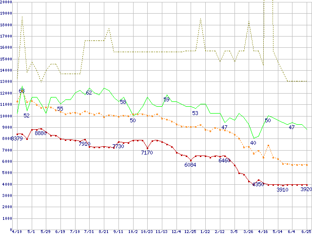 ※このグラフは過去のデータも税率5%相当に調整した税込み相当額のグラフです。 税率変更や、総額表示方式導入(2004年4月)の影響は除いています。 | | | ●凡例 | 最安値 (点線部は販売店未確認 または未調査) | 平均値 | 最高値 | ショップ数 |