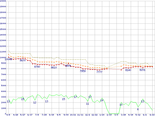 ※このグラフは過去のデータも税率5%相当に調整した税込み相当額のグラフです。 税率変更や、総額表示方式導入(2004年4月)の影響は除いています。 | | | ●凡例 | 最安値 (点線部は販売店未確認 または未調査) | 平均値 | 最高値 | ショップ数 |