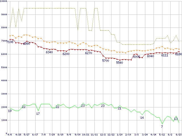 ※このグラフは過去のデータも税率5%相当に調整した税込み相当額のグラフです。 税率変更や、総額表示方式導入(2004年4月)の影響は除いています。 | | | ●凡例 | 最安値 (点線部は販売店未確認 または未調査) | 平均値 | 最高値 | ショップ数 |