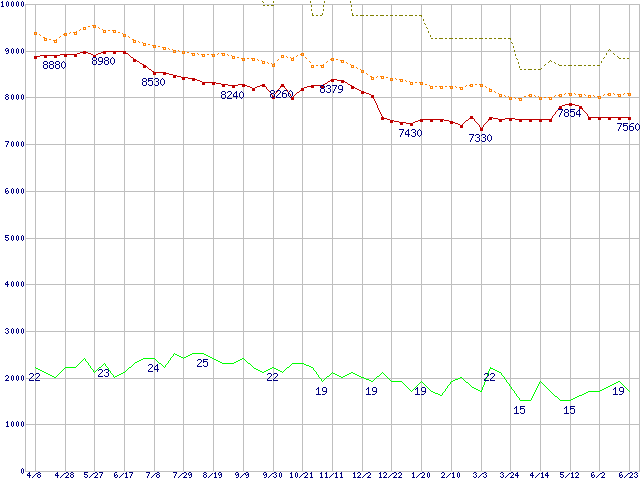 ※このグラフは過去のデータも税率5%相当に調整した税込み相当額のグラフです。 税率変更や、総額表示方式導入(2004年4月)の影響は除いています。 | | | ●凡例 | 最安値 (点線部は販売店未確認 または未調査) | 平均値 | 最高値 | ショップ数 |