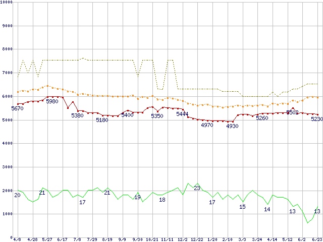 ※このグラフは過去のデータも税率5%相当に調整した税込み相当額のグラフです。 税率変更や、総額表示方式導入(2004年4月)の影響は除いています。 | | | ●凡例 | 最安値 (点線部は販売店未確認 または未調査) | 平均値 | 最高値 | ショップ数 |