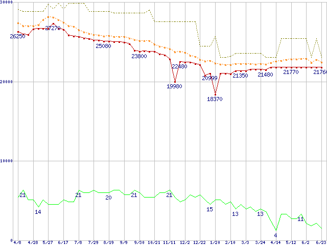 ※このグラフは過去のデータも税率5%相当に調整した税込み相当額のグラフです。 税率変更や、総額表示方式導入(2004年4月)の影響は除いています。 | | | ●凡例 | 最安値 (点線部は販売店未確認 または未調査) | 平均値 | 最高値 | ショップ数 |