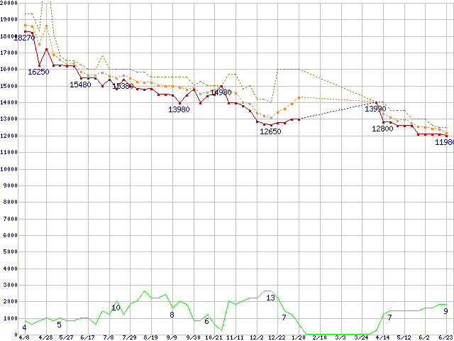 ※このグラフは過去のデータも税率5%相当に調整した税込み相当額のグラフです。 税率変更や、総額表示方式導入(2004年4月)の影響は除いています。 | | | ●凡例 | 最安値 (点線部は販売店未確認 または未調査) | 平均値 | 最高値 | ショップ数 |