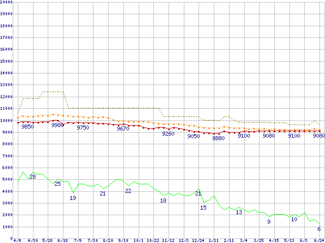 ※このグラフは過去のデータも税率5%相当に調整した税込み相当額のグラフです。 税率変更や、総額表示方式導入(2004年4月)の影響は除いています。 | | | ●凡例 | 最安値 (点線部は販売店未確認 または未調査) | 平均値 | 最高値 | ショップ数 |