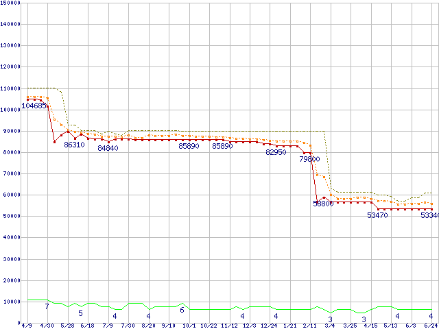 ※このグラフは過去のデータも税率5%相当に調整した税込み相当額のグラフです。 税率変更や、総額表示方式導入(2004年4月)の影響は除いています。 | | | ●凡例 | 最安値 (点線部は販売店未確認 または未調査) | 平均値 | 最高値 | ショップ数 |