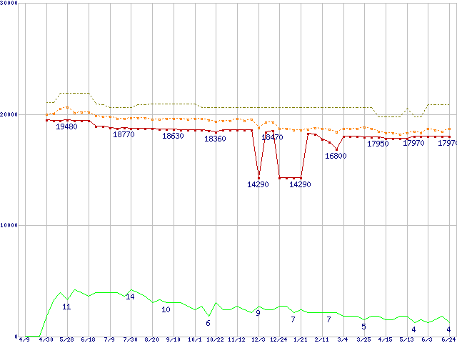 ※このグラフは過去のデータも税率5%相当に調整した税込み相当額のグラフです。 税率変更や、総額表示方式導入(2004年4月)の影響は除いています。 | | | ●凡例 | 最安値 (点線部は販売店未確認 または未調査) | 平均値 | 最高値 | ショップ数 |