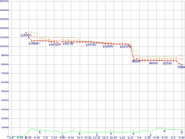 ※このグラフは過去のデータも税率5%相当に調整した税込み相当額のグラフです。 税率変更や、総額表示方式導入(2004年4月)の影響は除いています。 | | | ●凡例 | 最安値 (点線部は販売店未確認 または未調査) | 平均値 | 最高値 | ショップ数 |