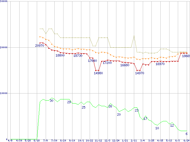 ※このグラフは過去のデータも税率5%相当に調整した税込み相当額のグラフです。 税率変更や、総額表示方式導入(2004年4月)の影響は除いています。 | | | ●凡例 | 最安値 (点線部は販売店未確認 または未調査) | 平均値 | 最高値 | ショップ数 |