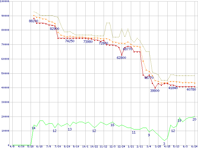 | Athlon 64 3800+(2.4GHz,L2 512KB) リテールパッケージの価格推移 | | | (2004年4月9日~2005年6月24日) |